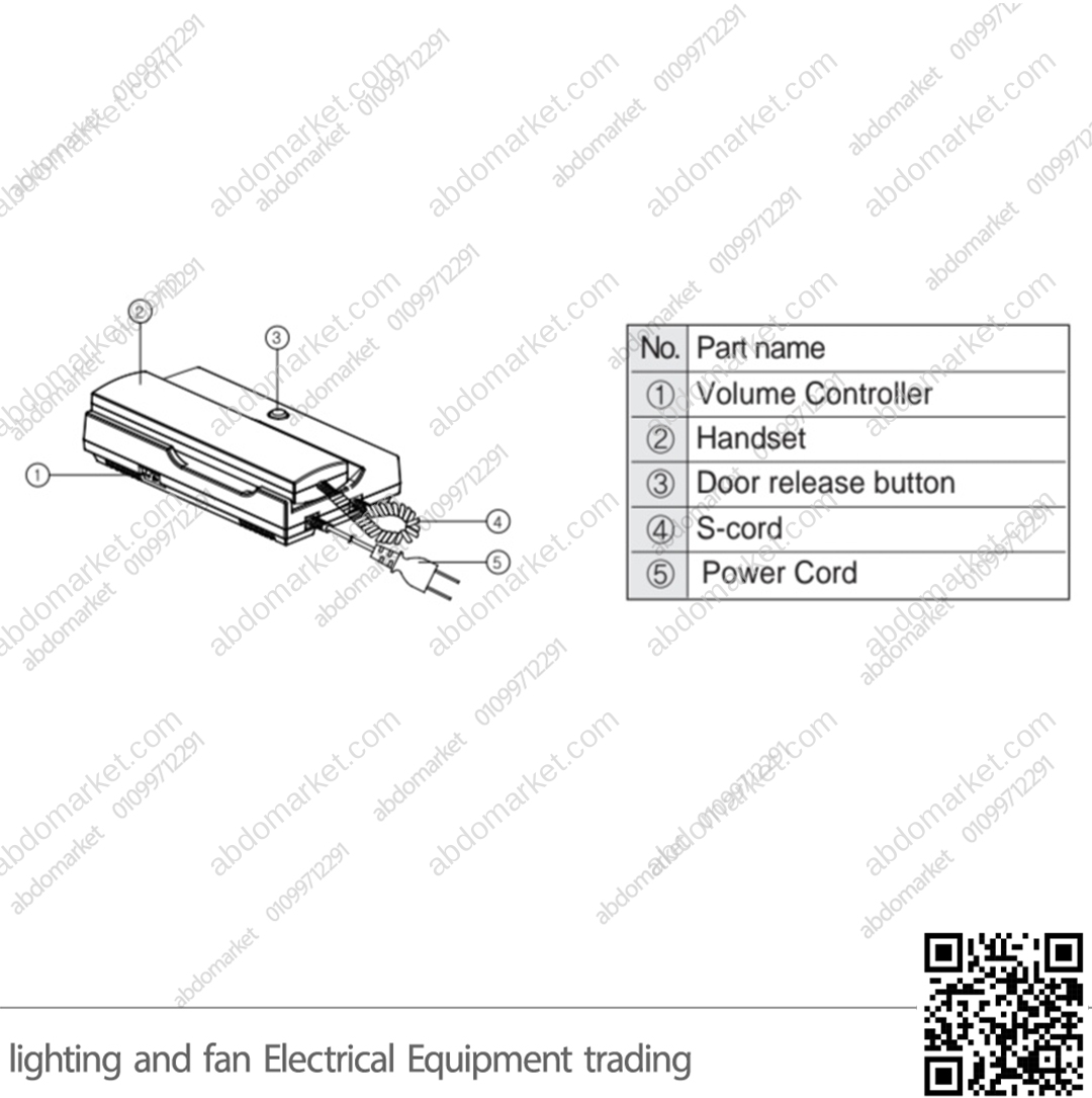 - المنظومة تعمل على جهد منخفض 12 فولت وبالتالي تحتاج إلى ترنس وتتألف هذه المنظومة من سماعة داخلية 1 زرار عدد 6 سماعات ولوحة خارجية 6 خط عدد 1 بالاضافة الى ترنس محوّل كوماكس 12 فولت