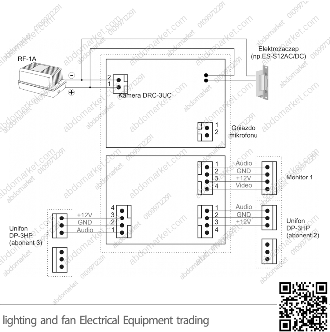 - هذا النظام يعمل على التيار 220 فولت ولا يحتاج إلى ترنس ويتألف من لوحة داخلية عدد 12 ولوحة خارجية بكاميرا 12 خط عدد 1 .