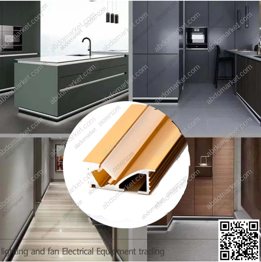 - قطاع اضاءة بروفايل معدني بلون ذهبي مميز بديل السيراميك يركب لطش او داخل الحائط ويظهر شكل وزرة مضاءة بالليد