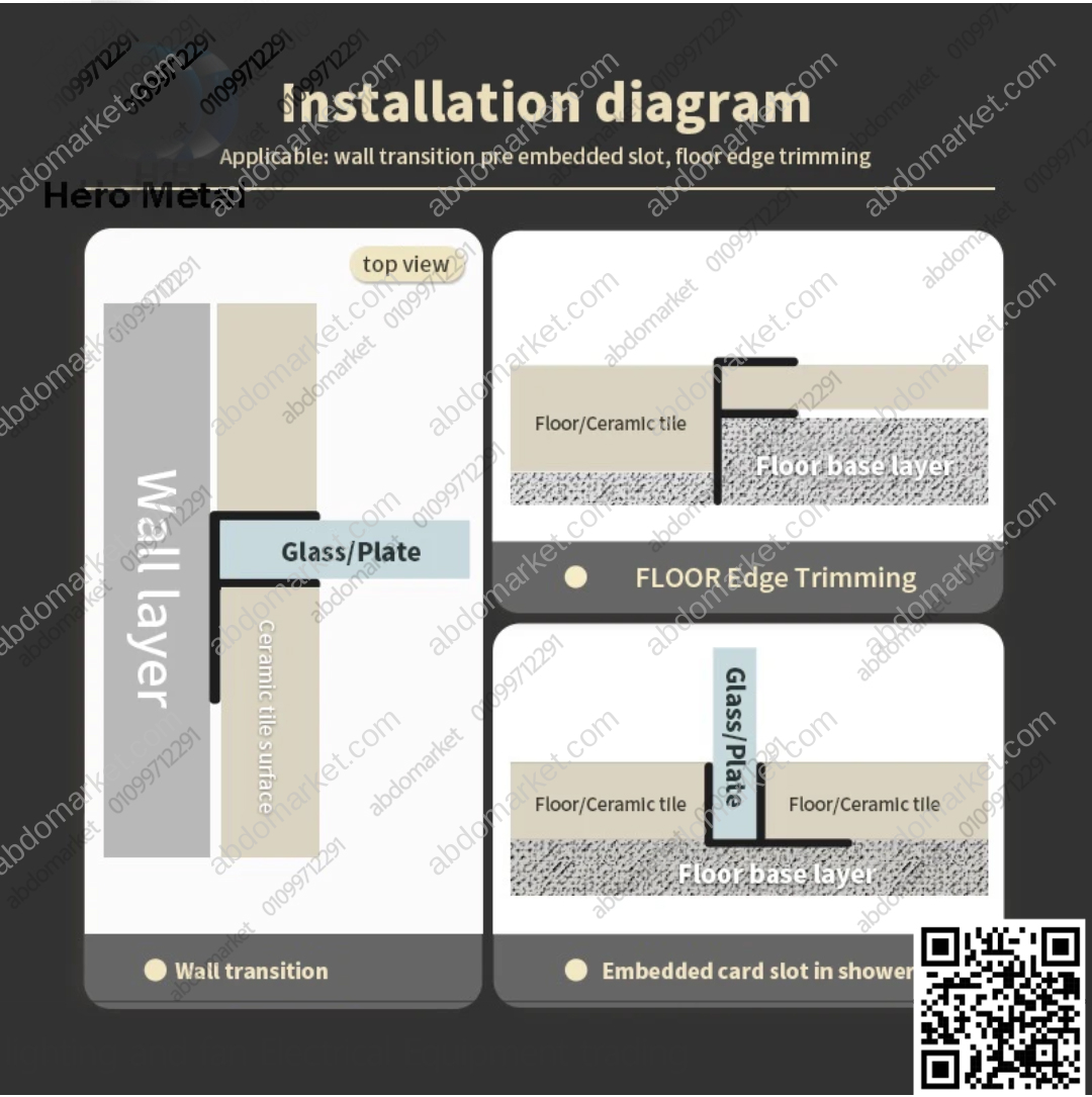 * بروفايل تثبيت زجاج شاور يأتي بطول 2.8 متر وثخانة 0.9 مم بلون مميز اسود حيث يتم تثبيته إما في الأرضية كقاعدة للقاطع الزجاجي ( خاصةً في الحمامات للفصل بين القسم الجاف والمبلل )